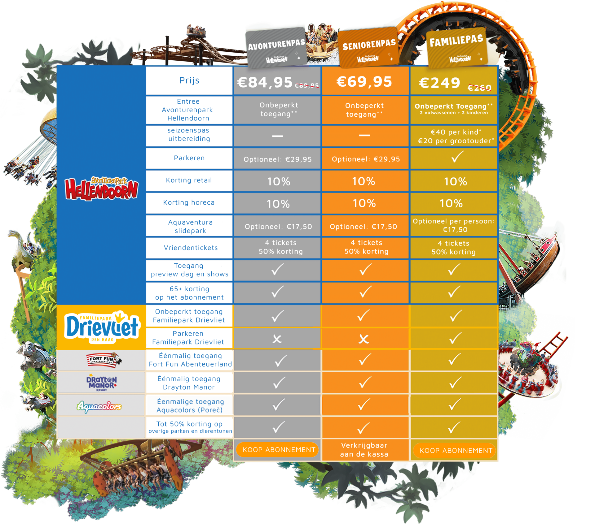 Krijg alle openingsdagen toegang tot Avonturenpark Hellendoorn en Familiepark Drievliet. Bij Avonturenpark Hellendoorn zijn ook de evenementen zoals Zinderende Zomeravonden, Screams en Heksendoorn toegankelijk. Voor Het Grote Sinterklaas Avontuur is wel een (gereduceerd) ticket benodigd.